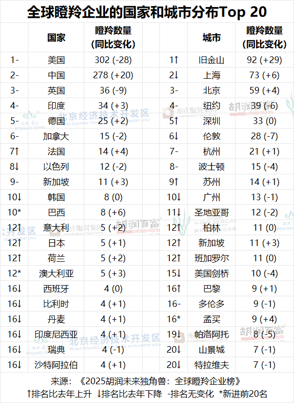 上证报中国证券网讯(记者 白丽斐)胡润研究院20日于北京亦庄发布的《2025胡润未来独角兽:全球瞪羚企业榜》显示,有206家新上榜企业,其中金融科技29家,人工智能28家,SaaS和机器人分别为15家。 据悉,胡润研究院在全球找到819家瞪羚企业,比两年前的688家增加了19%,分布在43个国家和220个城市。榜单列出了全球成立于2000年之后,三年内(即到2028年底)最有可能达到独角兽级十亿美金估值的高成长性企业。这也是胡润研究院第五次发布“全球瞪羚企业榜”。 35%的瞪羚企业由人工智能驱动 从行业来看,2025年增长最快的行业是机器人、人工智能、半导体、金融科技和航天。胡润研究院发布的榜单显示,206家新上榜企业中,来自金融科技行业的企业有29家,人工智能28家,软件服务和机器人各15家。 胡润百富董事长兼首席调研官胡润表示,胡润瞪羚企业非常年轻,平均年龄9岁,但平均价值已经达到7亿美元。人工智能的影响最大,现在有35%的瞪羚企业由人工智能驱动,而随着创始人找到降低成本的方法,金融科技和SaaS继续增长。生成式人工智能、机器学习、增强现实和虚拟现实、云计算、物联网和自动化的融合正在为创新创业企业创造前所未有的机会,引领新时代。 人工智能正在彻底改变全球各行业,推动效率、创新和增长。此次胡润研究院公布的瞪羚企业榜单包含了71家人工智能企业。 “在医疗健康领域,人工智能有助于诊断、个性化医疗和药物研发;金融行业利用人工智能进行欺诈检测、风险管理和算法交易;零售和电子商务受益于人工智能驱动的个性化、库存优化和聊天机器人;制造业将人工智能用于自动化、预测性维护和质量控制。人工智能迅速融入多个领域,凸显了其在重塑未来工作、技术和经济方面的变革性作用。”胡润说。 生物科技和半导体成为中国未来独角兽数量最多的行业 榜单显示,中国有278家胡润瞪羚,比去年增加了20家,位居第二,占胡润全球瞪羚总数的34%。自2019年以来,胡润瞪羚在中国的数量几乎翻了两番。其中,生物科技和半导体脱颖而出,占全国总数的三成,成为未来独角兽数量最多的行业。 从城市来看,中国瞪羚企业数量最多的是上海和北京,其次是深圳、杭州、苏州和广州。榜单显示,中国的胡润瞪羚企业代表为与爱为舞、星迈创新和星海图。 榜单还包括《2025胡润全球瞪羚投资机构》,中国的红杉是全球最成功的胡润瞪羚投资机构,其次是中金、软银、高瓴和老虎环球基金。 除了主榜单,此次胡润研究院还甄选出了北京亦庄“种子瞪羚企业”22家,他们均拥有国家级荣誉资质(例如国家级科技型中小企业、国家级高新技术企业、国家级专精特新“小巨人”企业等)或最近两年获得过A轮以上的融资,这些企业有机会在未来登上胡润瞪羚企业榜。他们是:凡恩世制药、国汽智控、路凯智行、悦琦创通、易智时代、华清科盛、数渡信息、神州光大、华翊博奥、永洪商智、铂生卓越生物、天广实生物、卓越未来国际医药、马威科技、英创汇智、航宇智造、欧铼德微电子、海致科技、强联智创、予果生物、亮亮视野、中安智能。