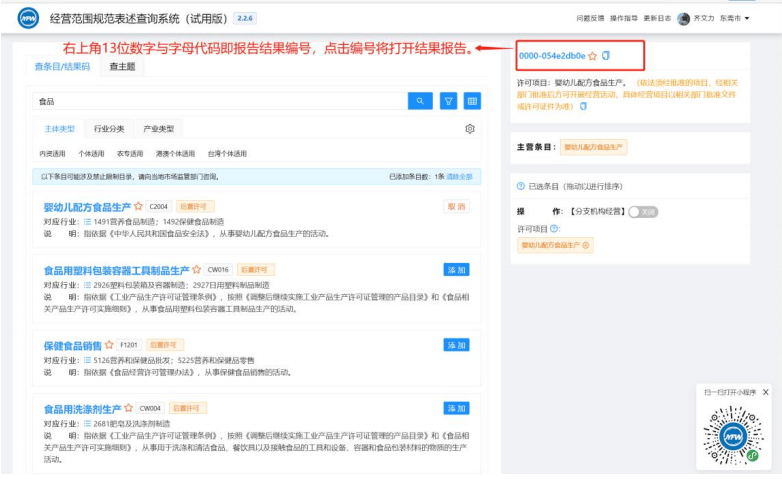 步骤三:点击13位数字与字母代码即可打开《经营范围规范表述预查结果报告》,将系统生成的经营范围条目及报告编号(经营范围组合码)同步填写到登记申请表格中,便于登记机关一键导入经营范围。