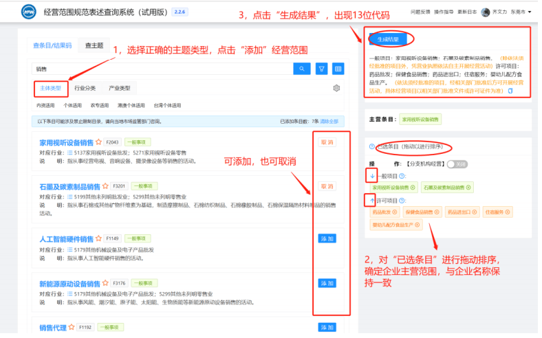 步骤二:申请人根据企业类别选择正确的“主体类型”,选择所需经营范围后点击“添加”,即可在右侧“已选条目”进行查看;点击“↓”“↑”箭头可调整“一般项目”与“许可项目”的顺序,拖动条目可确定主营条目并对其他经营范围进行排序,主营条目应当与企业名称中的行业特点相对应;选定后点击右上方“生成结果”,即可生成13位数字与字母代码。