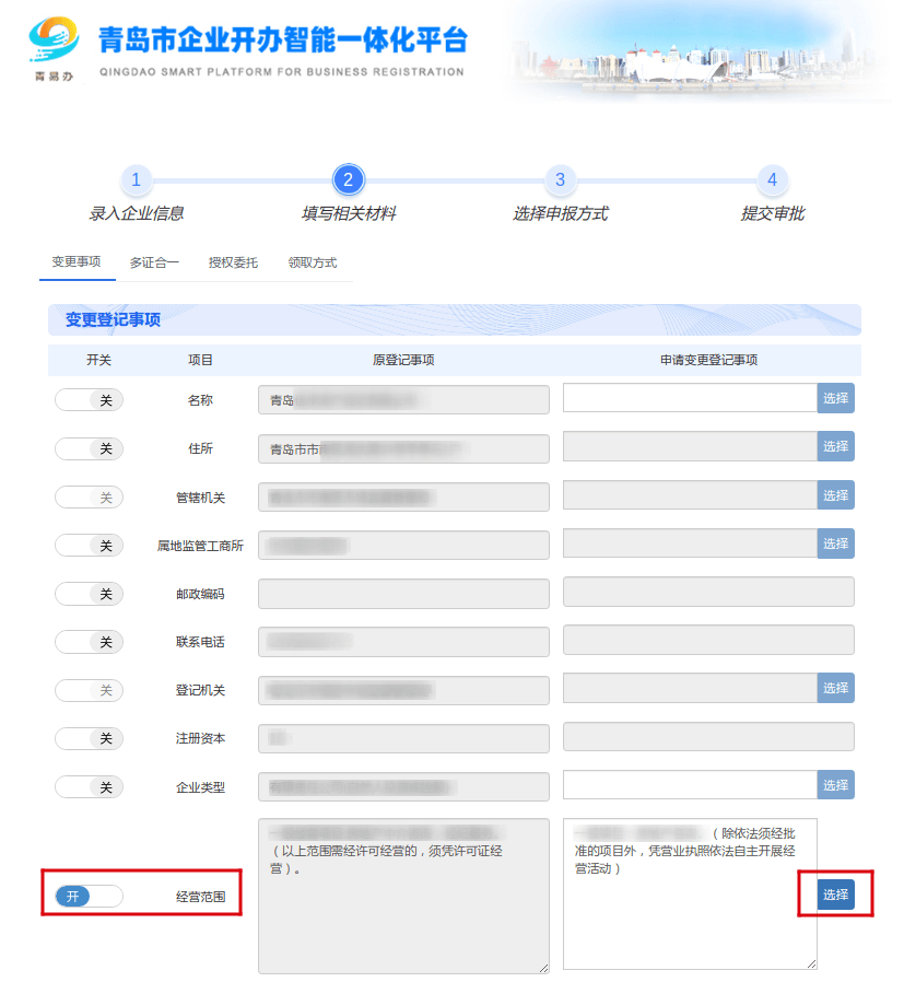 第四步:在“填写相关材料”界面,找到“变更登记事项”中的“经营范围”,点击右侧“选择”,进入经营范围规范表述查询系统。
