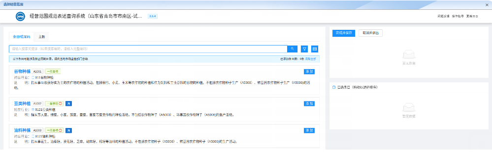 步骤一:申请人登录经营范围规范表述查询系统(网址为:,利用关键字或主题查询所需经营范围。