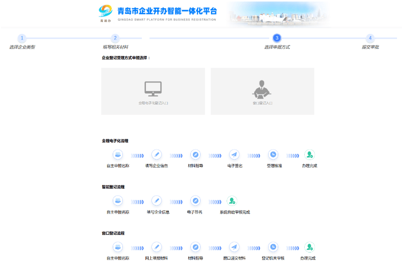 第七步:选择申报方式。自主填写完成企业信息后,系统提供全程电子化登记、窗口登记两种申报方式,推荐使用全程电子化登记方式办理业务。