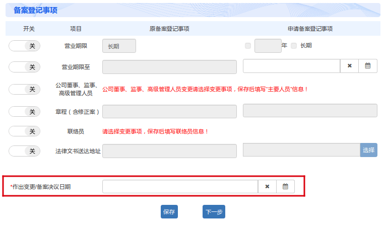 第六步:在“备案登记事项”模块中,填写作出变更决议的日期,保存并点击“下一步”。再根据企业实际情况,填写许可经营、多证合一、授权委托、营业执照领取方式等信息。