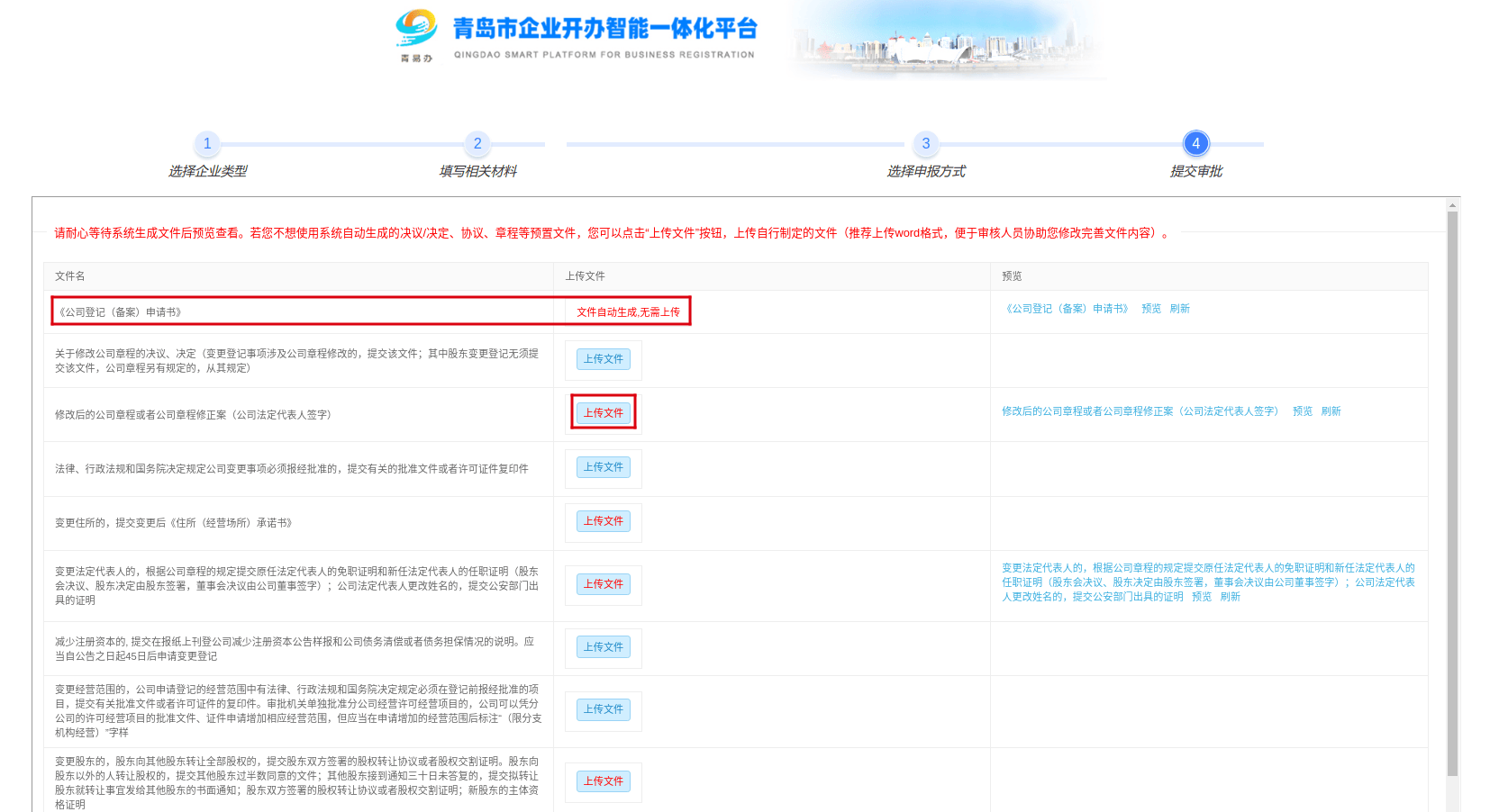 (1)根据企业填写的基本信息,系统自动生成登记所需要提交的标准化法律文书。若您不想使用系统自动生成的决议/决定、协议、章程等预置文件,也可以点击“上传文件”按钮,上传自行制定的文件。